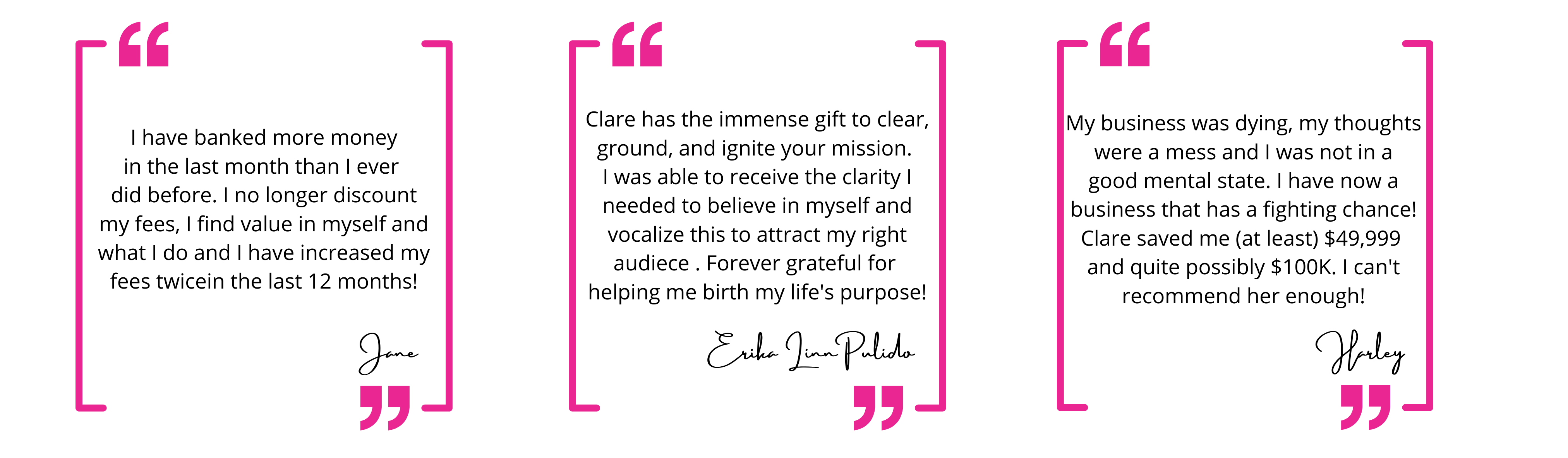Earnings and income representations made by Clare Williamson, are aspirational statements only of your earnings’ potential. The success of Clare Williamson, testimonials and other examples used are exceptional, non-typical results and are not intended to be and are not a guarantee that you or others will achieve the same results. Individual results will always vary and yours will depend entirely on your individual capacity, work ethic, business skills and experience, level of motivation, diligence in applying Clare Williamson’s programs, the economy, the normal and unforeseen risks of doing business, and other factors. Building your empire takes time and effort. These results are not guaranteed and depend on your level of diligence and other external factors.